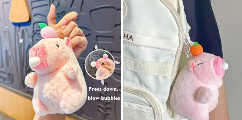 Con Capybara come design principale, l'immagine mostra la lussuosa forma di Capybara. Questo materiale lussuoso può rappresentare meglio l'aspetto della Capybara e l'immagine generale è estremamente adorabile. Capybara è disponibile in due colori diversi, vale a dire rosa e marrone. Sulle loro teste ci sono frutti diversi, come cachi, pesche e mele, e i loro occhi si squittiscono. Questo portachiavi di peluche Capybara ha anche una funzione interattiva. Finché tiri la corda, la sua coda può ruotare. Quando pizzichi la sua faccia, può soffiare bolle e quando si soffia bolle, può persino emettere suoni. Le sue competenze uniche possono attrarre in modo più efficace i clienti e vincere il loro favore.
