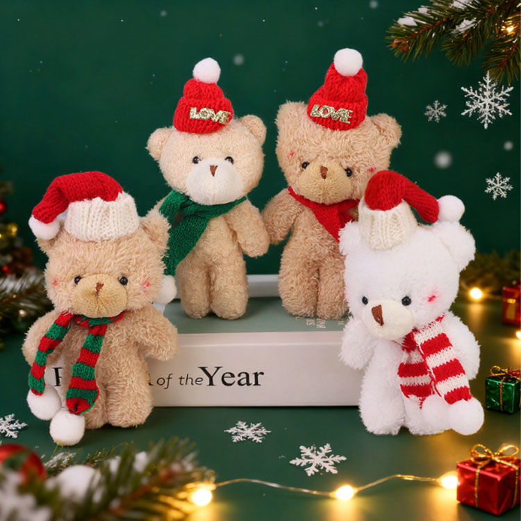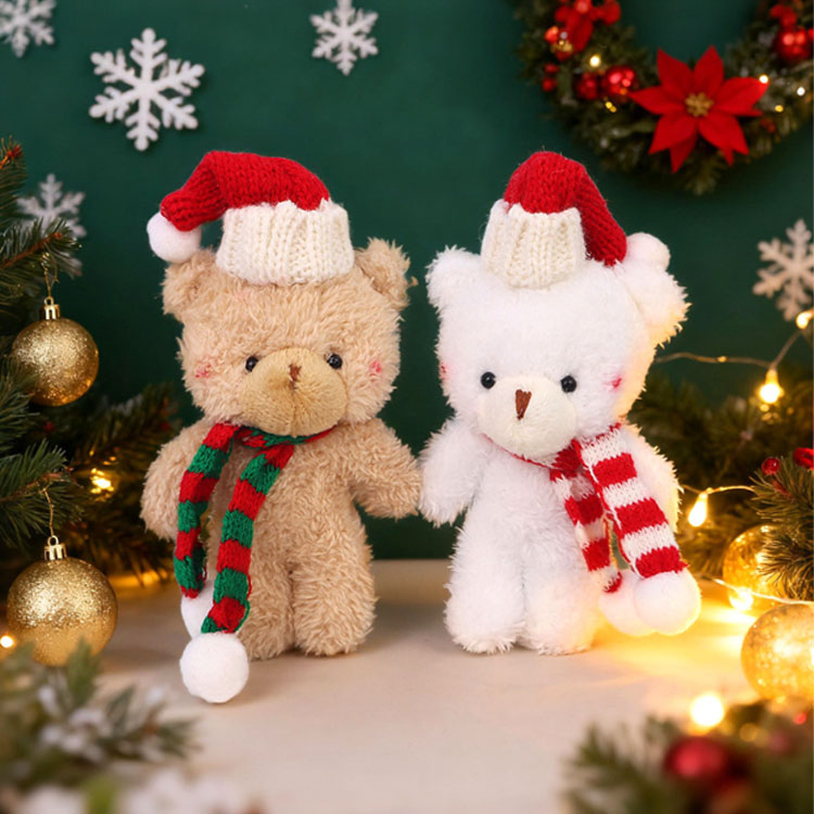 Questo giocattolo di peluche di Natale è sotto forma di orsacchiotto, ha due materiali diversi, vale a dire Plush e Teddy Fleece. La pelliccia del pile orsacchiotto è leggermente riccia. Entrambi i materiali hanno una consistenza morbida e morbida e sono molto leggeri. L'orsacchiotto dell'orsacchiotto è disponibile in due colori: marrone chiaro e marrone scuro. L'orso peluche ha anche due colori: marrone e bianco. Ogni orso è abbinato a una sciarpa diversa e ogni orso indossa un cappello di Natale rosso, aggiungendo un tocco festivo. Le sciarpe e i cappelli degli orsi sono lavorati a maglia e sono decorati con pompon bianchi, che sembrano molto delicati. Gli occhi dell'orso sono neri e le sue guance sono punteggiate di fard, rendendolo molto carino. Il suo aspetto ha vinto l'amore di molti clienti.