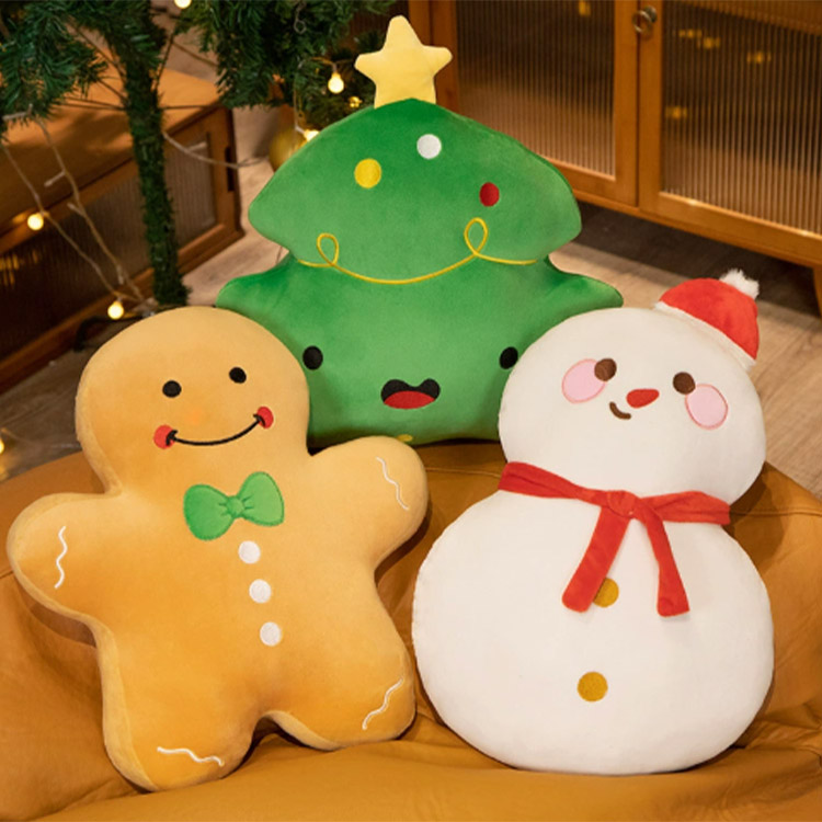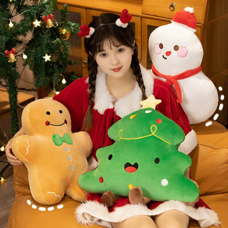 Questo peluche è in stile natalizio. Gli stili sono molto popolari, inclusi peluche di pan di zenzero, piccoli pupazzi di neve e alberi di Natale. I loro tessuti sono tutti realizzati in peluche e imbottiti con cotone PP all'interno. Non solo sono belli e adatti alla decorazione della stanza, ma possono anche essere usati come cuscini e cuscini, il che è molto pratico.