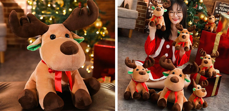 L'immagine del personaggio: Babbo Natale era basato sul vescovo Nicholas nel III secolo d.C. ed era noto per la sua generosità e la cura dei bambini. Nei tempi moderni, è raffigurato come un vecchio con una barba bianca, vestito con una veste rossa e indossa un cappello rosso. La leggenda narra che cavalca un cervo e tira una slitta per consegnare regali. La peluche per renne farà sentire le persone come se Babbo Natale fosse arrivato con regali non appena lo vedono, dando alle persone una sensazione molto calda e felice e allo stesso tempo, è pieno di atmosfera festosa.