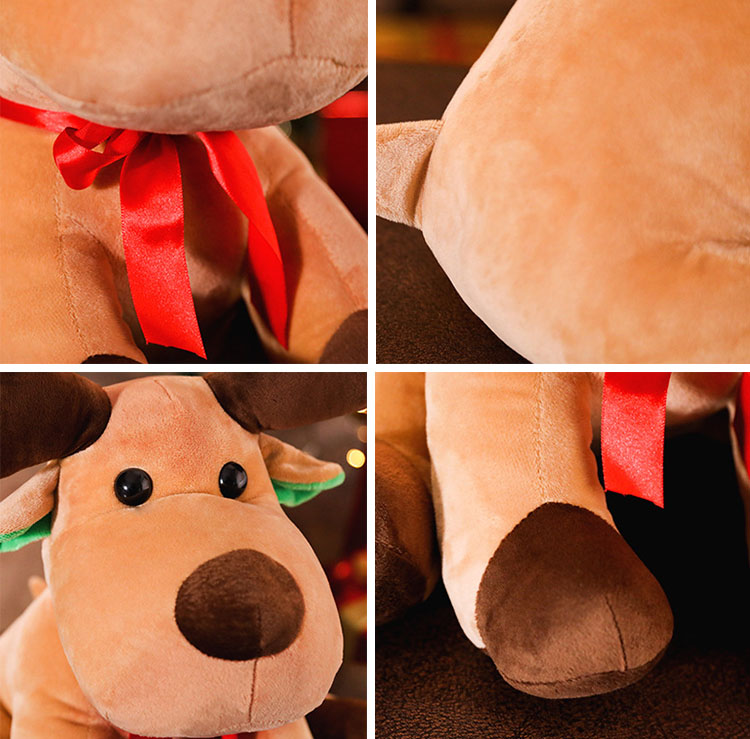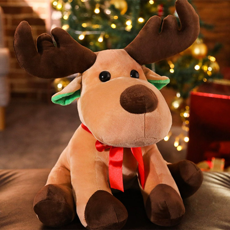 Questo peluche di renna è di colore marrone chiaro molto caldo. La coppia di corna marroni sulla sua testa è molto carina ed esagerata. I suoi occhi neri rotondi, il naso marrone scuro e gli accenti verdi all'interno delle orecchie gli danno un aspetto elegante e tridimensionale. L'arco rosso brillante legato al collo si aggiunge all'atmosfera festosa. L'aspetto morbido di questo piccolo cervo fa sentire immediatamente gioioso durante le festività natalizie, come se potesse portarti un regalo in qualsiasi momento.